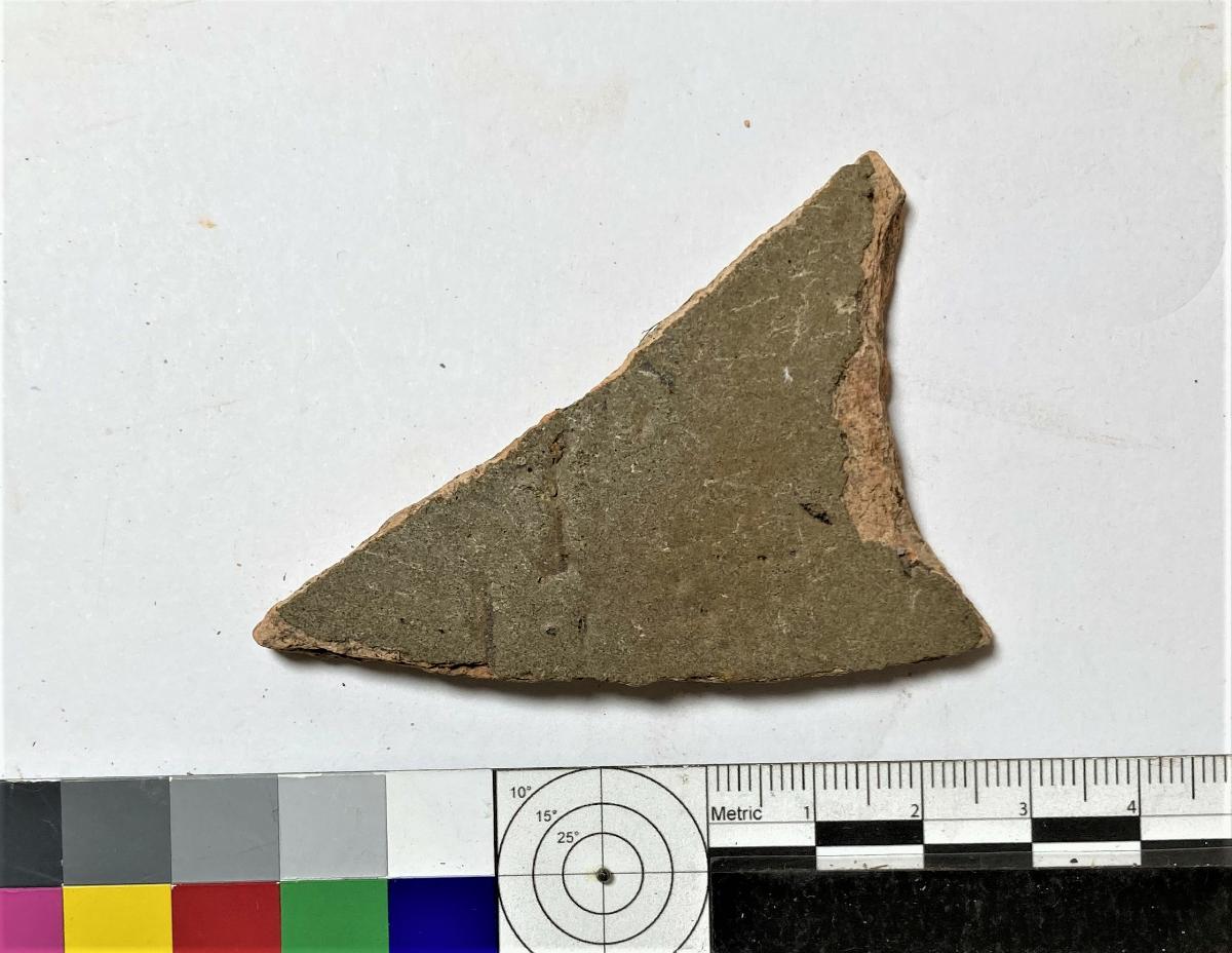 Skärva av kärl, lätt välvd. Triangulär, avbruten i alla kanter. Grågrön glasyr på utsidan.