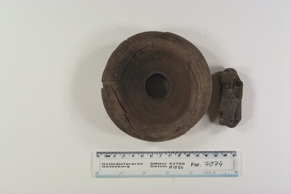 Föremålet är från vraket av ostindiefararen Götheborg, som gjorde tre resor till Kina 1739-45. Vid hemkomsten från den sista resan 12 september 1745 förliste fartyget vid grundet Hunnebådan strax utanför Nya Elfsborgs fästning. Vid flera tillfällen har material tagits upp från vraket. Föremålet kommer från de marinarkeologiska utgrävningarna på platsen 1986-1992.