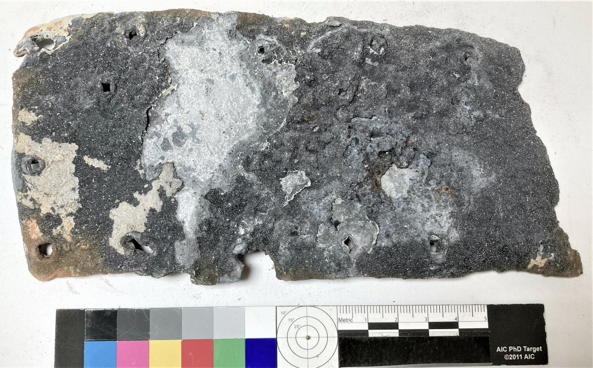 Blyplåt, kraftigt korroderad, hål efter spik längs kanterna.