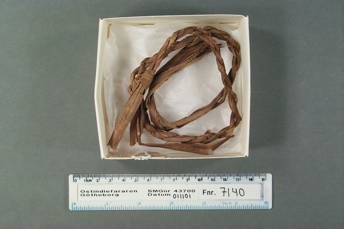Ihoprullad lindbastrep, tvinnat av två parter. Sammanknutet med överhandsknop i ena änden, avbrutet i andra änden.