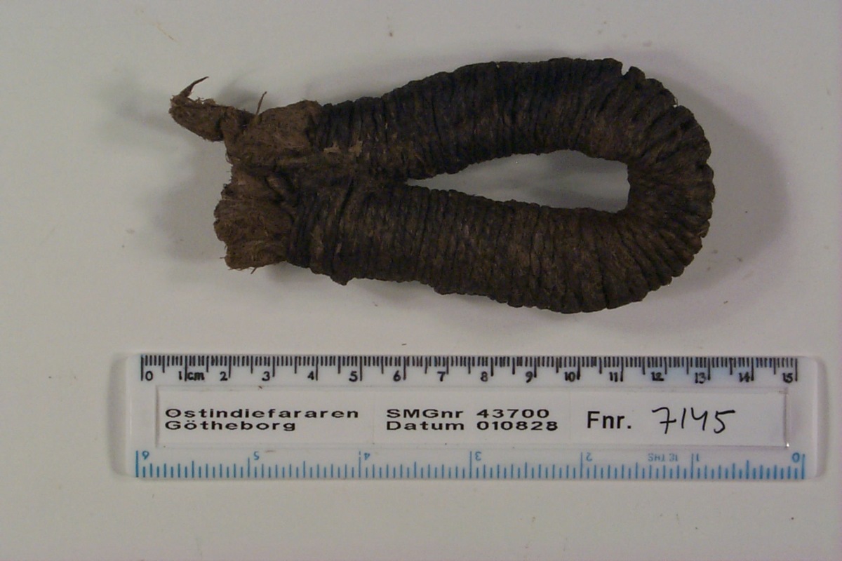 Föremålet är från vraket av ostindiefararen Götheborg, som gjorde tre resor till Kina 1739-45. Vid hemkomsten från den sista resan 12 september 1745 förliste fartyget vid grundet Hunnebådan strax utanför Nya Elfsborgs fästning. Vid flera tillfällen har material tagits upp från vraket. Föremålet kommer från de marinarkeologiska utgrävningarna på platsen 1986-1992.