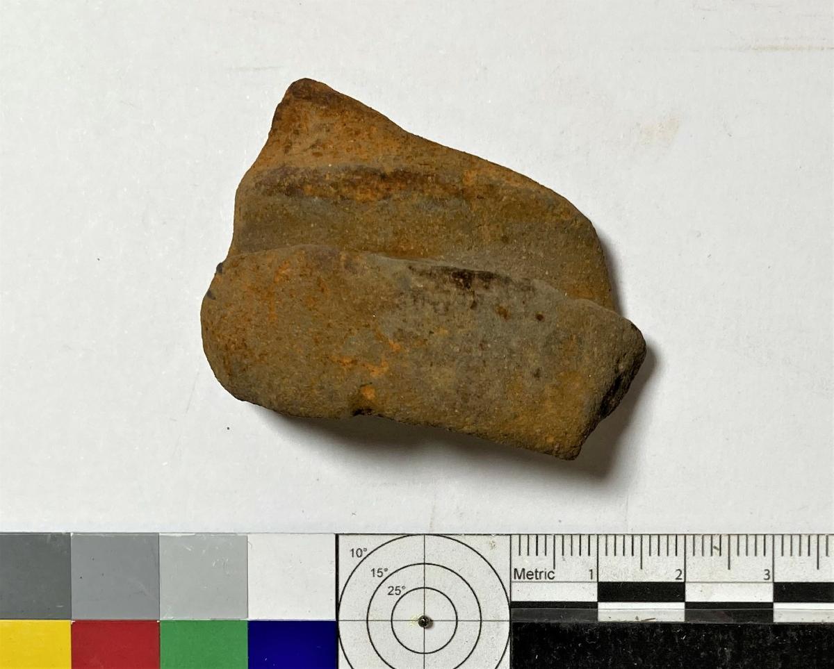 Skärva av kärl, kantbit, välvd. Tegelfärgad, oglaserad.
