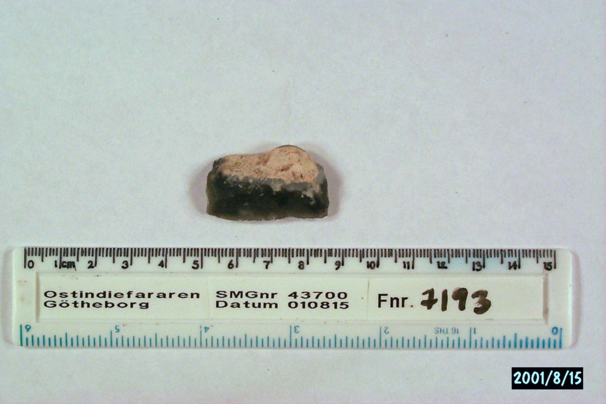 Föremålet är från vraket av ostindiefararen Götheborg, som gjorde tre resor till Kina 1739-45. Vid hemkomsten från den sista resan 12 september 1745 förliste fartyget vid grundet Hunnebådan strax utanför Nya Elfsborgs fästning. Vid flera tillfällen har material tagits upp från vraket. Föremålet kommer från de marinarkeologiska utgrävningarna på platsen 1986-1992.