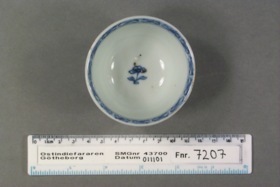 Kategori A; underglasyrblå dekor. Ett större kantavslag i mynningskanten. Två bruna uppskjutande fläckar i botten på insidan. Lätt repig på utsidan.