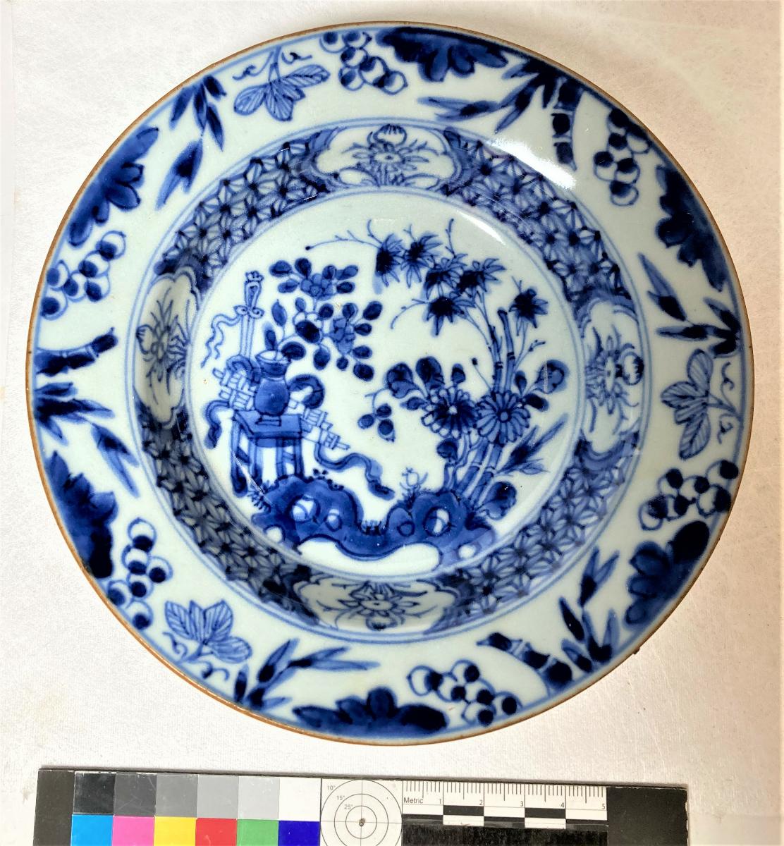 Kategori A; Underglasyrblå dekor. Motiv; "de hundra antikviteterna". Dekor även på undersidan brättet. Lätt repig i botten.