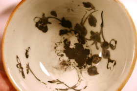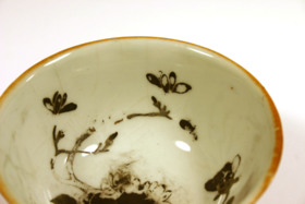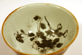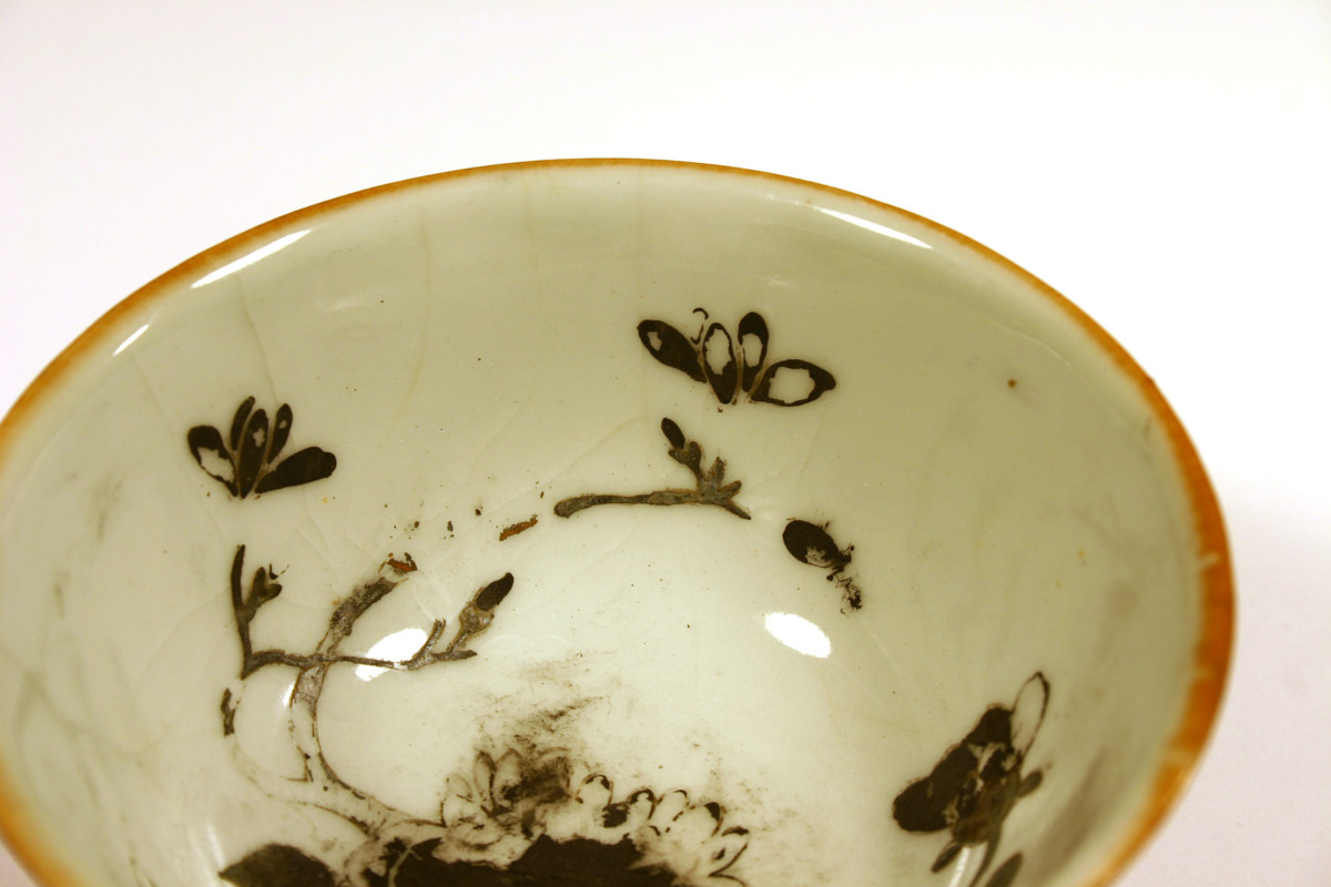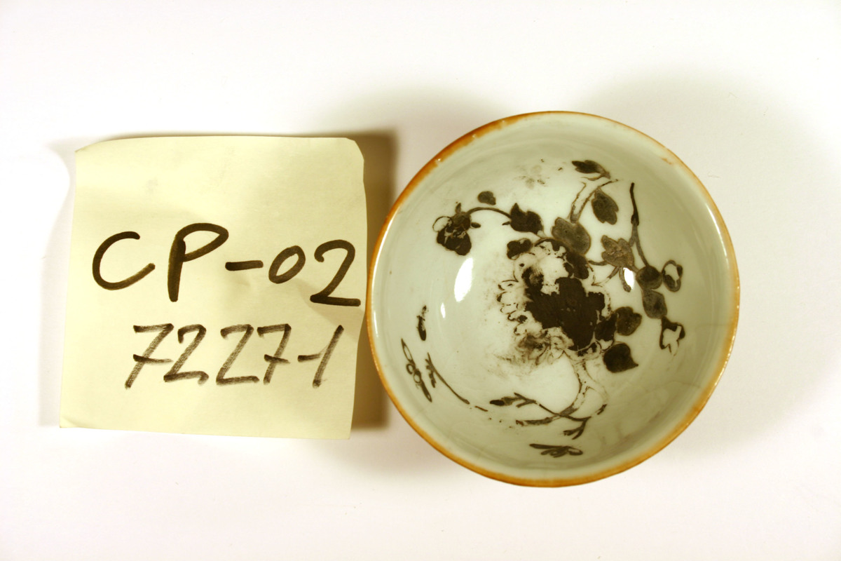 Kategori D; Brun glasyr på utsidan och emaljfärgsdekor på insidan. Bortfallen emaljfärgsdekor.