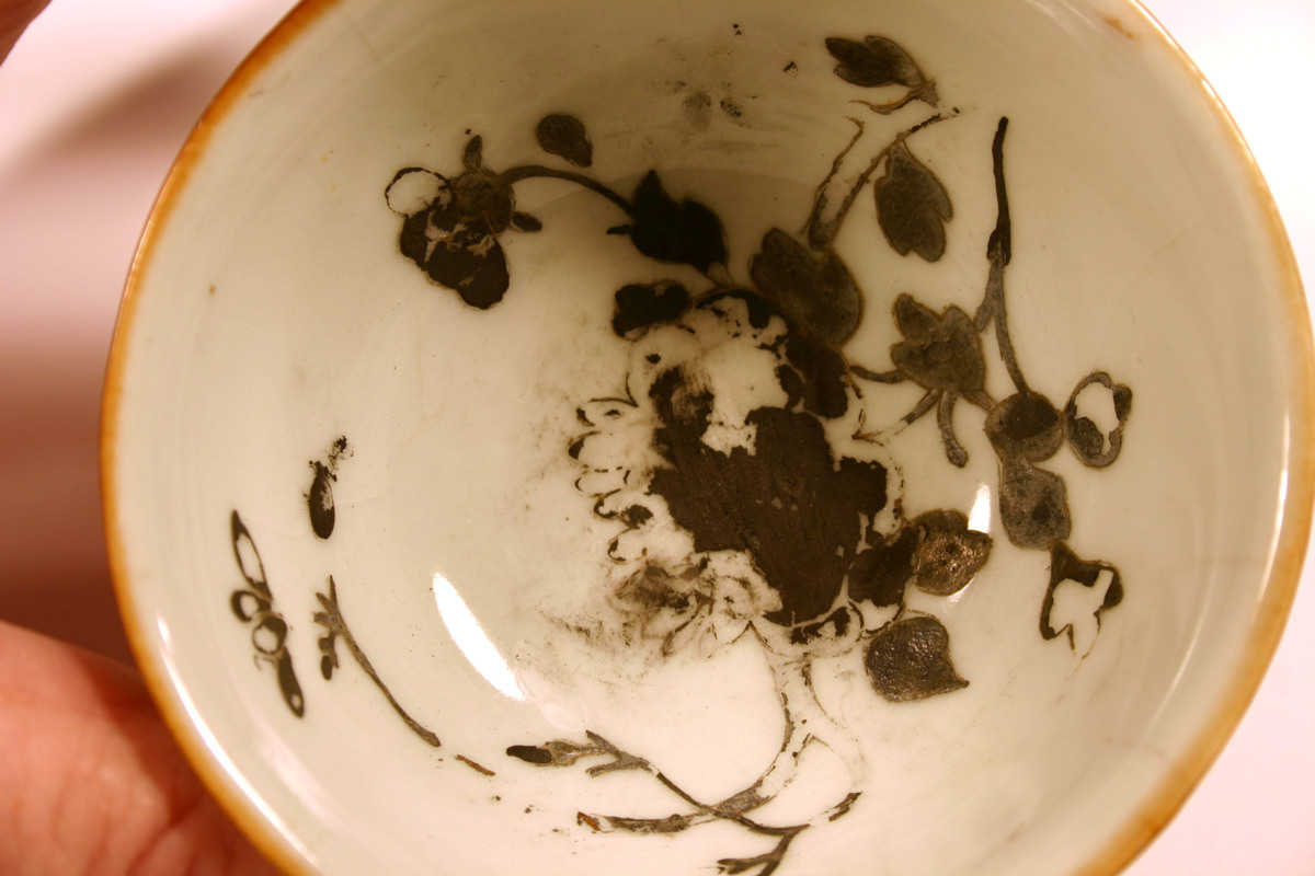 Dekorfärg på insidan lös och delvis borta.