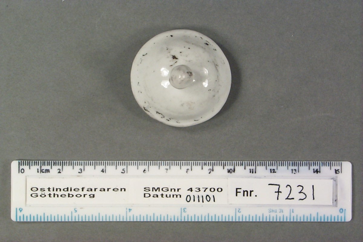 Kategori G; vitt med emaljfärgsdekor. Litet lock till kanna eller burk. Kant för passning mot mynningskant, droppformad knopp. Dekoren delvis bortfallen; endast spår och diffusa svarta rester.