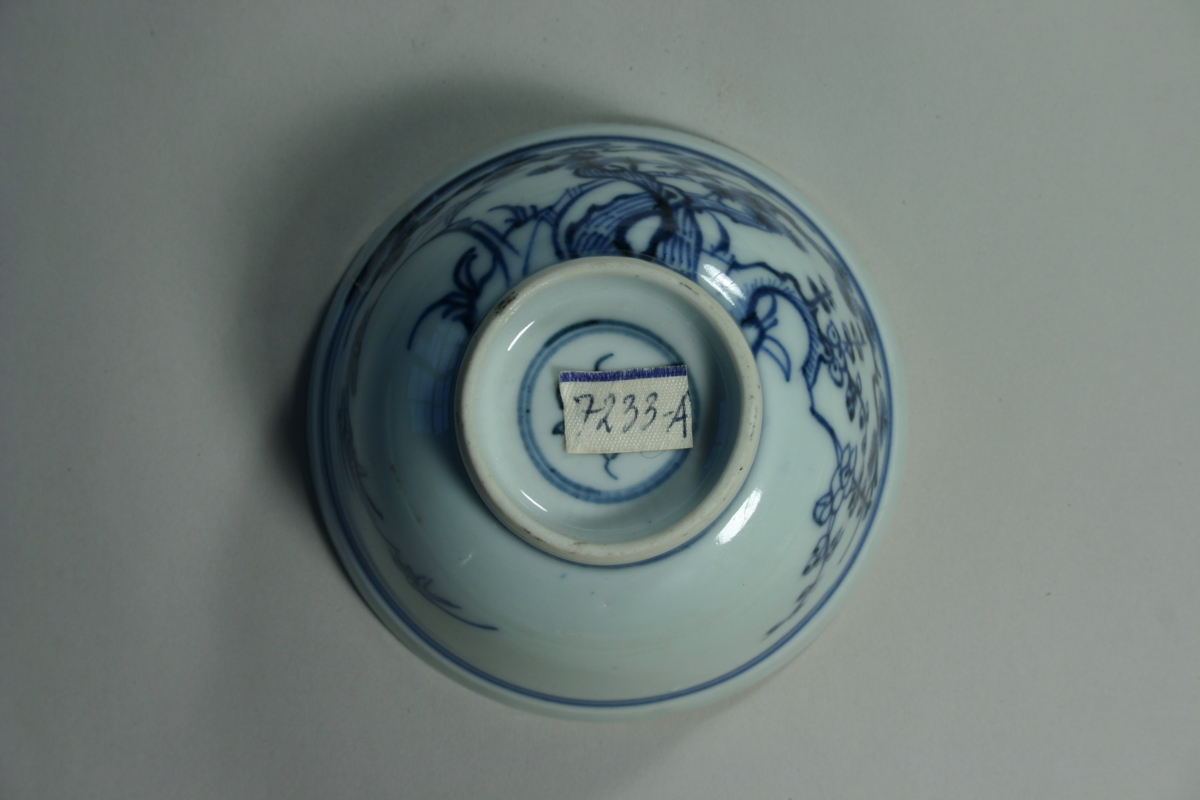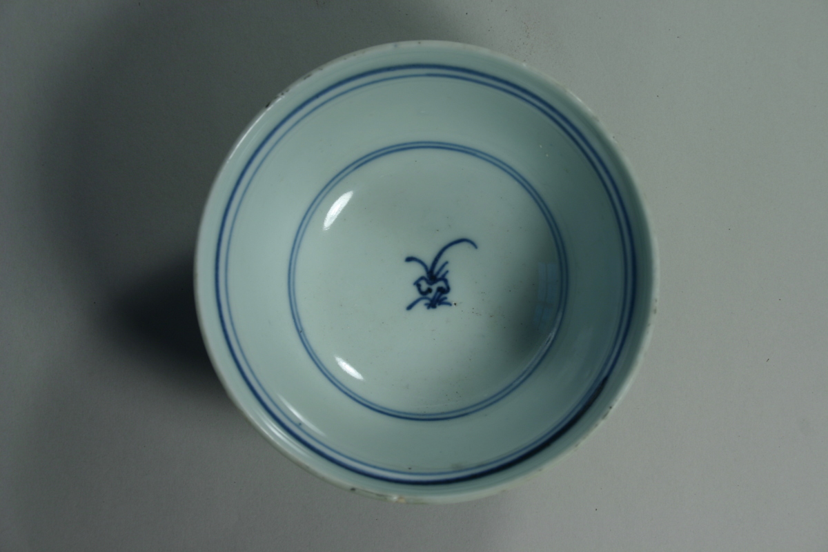 Skål, vit med blå underglasyrdekor. På utsidan blommande träd och på insidan en liten symbol och två par cirkulära ränder.