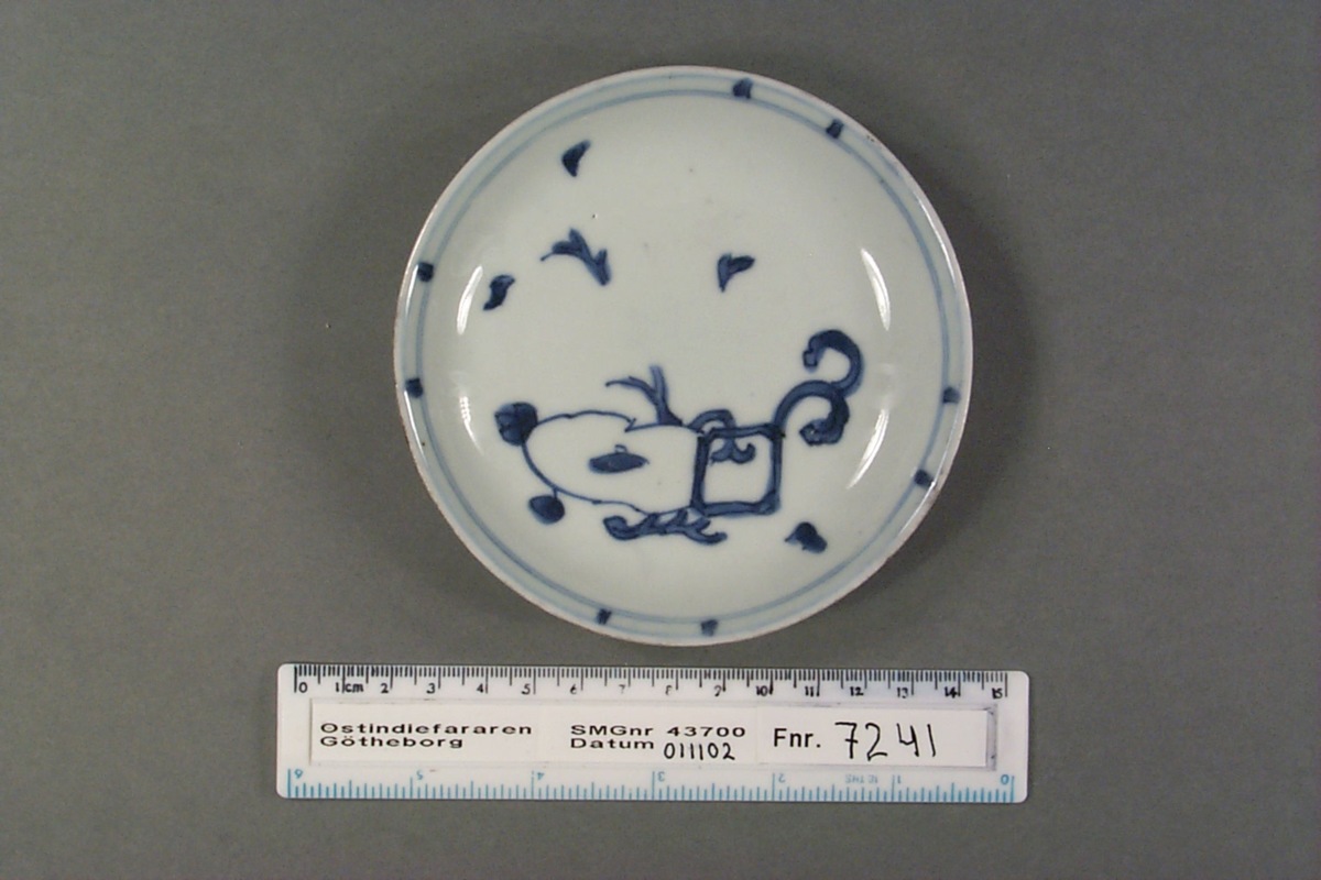 Kategori B; Underglasyrblå dekor och emaljfärger på glasyren, s.k. Kinesiskt Imariporslin. Motiv; rankor och blommor. Emalgfärgdekoren borta, sotig/smutsig på baksidan.