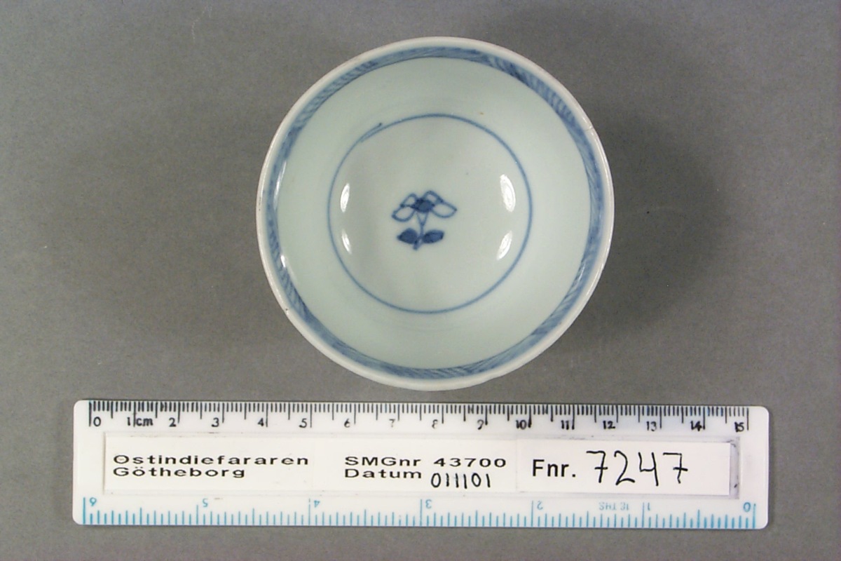 Kategori A; underglasyrblå dekor. Lätt repig på utsidan,