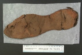 1) Sula, innerdel av vänstersula. Hål för söm med tråd runt hela kanten förutom på insidan. Sliten av användning mitt på trampytan. Rester av tjära på utsidan. Viss missfärgning av järnkorrosion.Visst mögelangrepp.