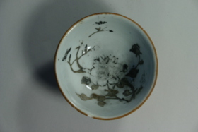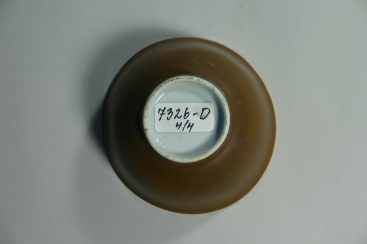 Kategori D; Brun glasyr på utsidan och emaljfärgsdekor på insidan. Bortfallen emaljfärgsdekor. Ett kantavslag i mynningskanten.