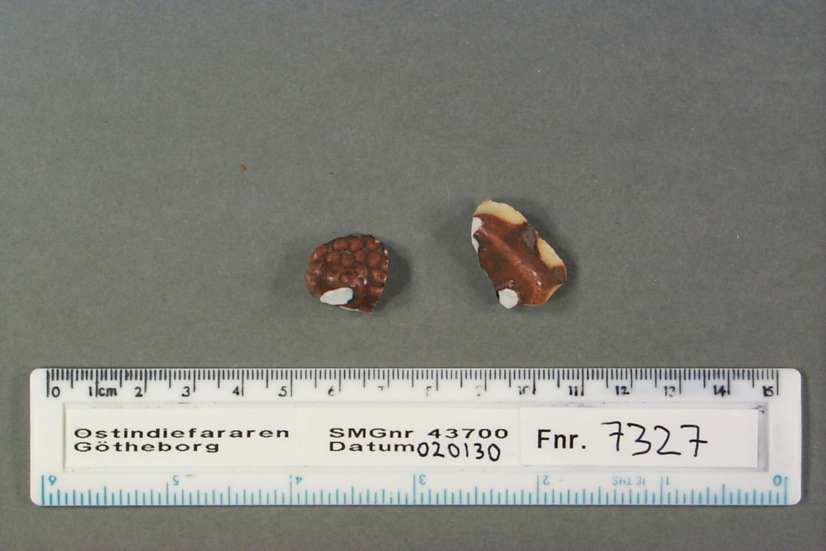 Skärvaor av figurin, vitt gods, brun glasyr på utsidan.