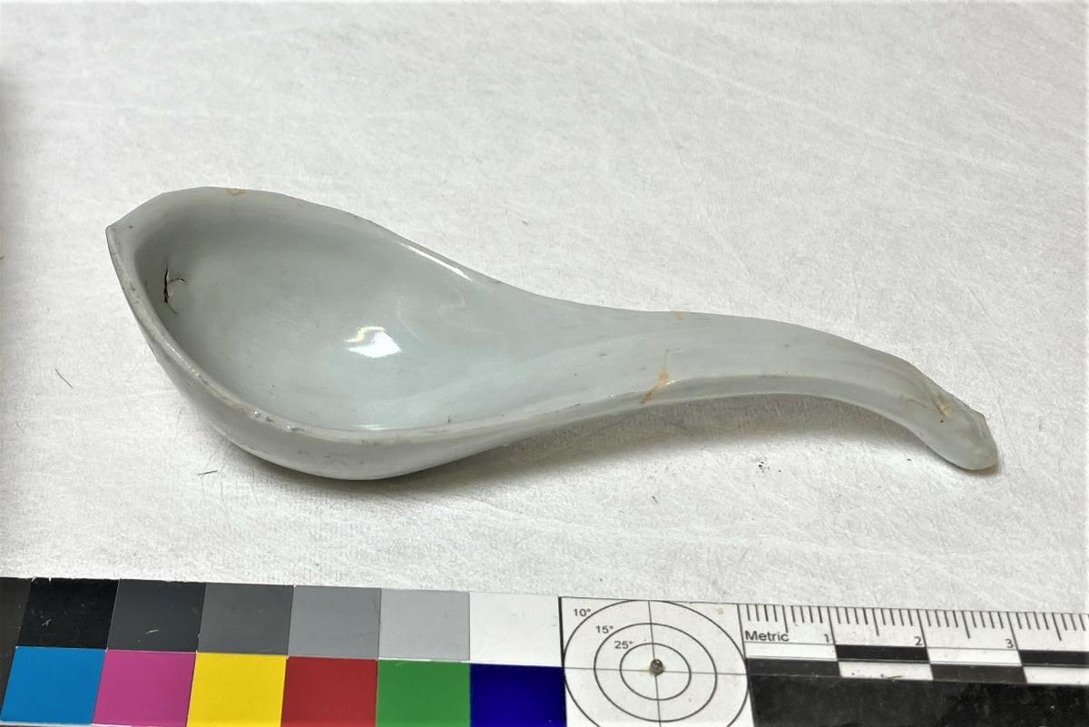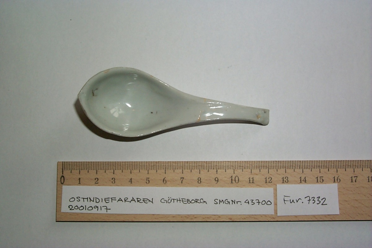 Föremålet kommer från lasten från vraket av ostindiefararen Götheborg, som gjorde tre resor till Kina 1739-45. Vid hemkomsten från den sista resan 12 september 1745 förliste fartyget vid grundet Hunnebådan strax utanför Nya Elfsborgs fästning. Vid flera tillfällen har material tagits upp från vraket. Föremålet kommer från de marinarkeologiska utgrävningarna på platsen 1986-1992.