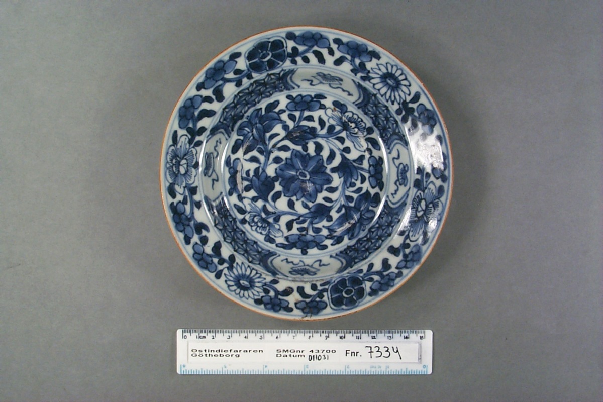 Kategori A; Underglasyrblå dekor; motiv: I botten en ranka av pion och gardenia, i kälningen en stjärnbård med blomreserver och runt brättet pion, krysantemum och prunus. Kvistrankor på brättets baksida. Brun mynningskant. Lätt repad i botten. Fin spricka i ena kanten, syns endast från baksidan.