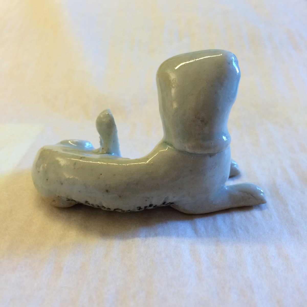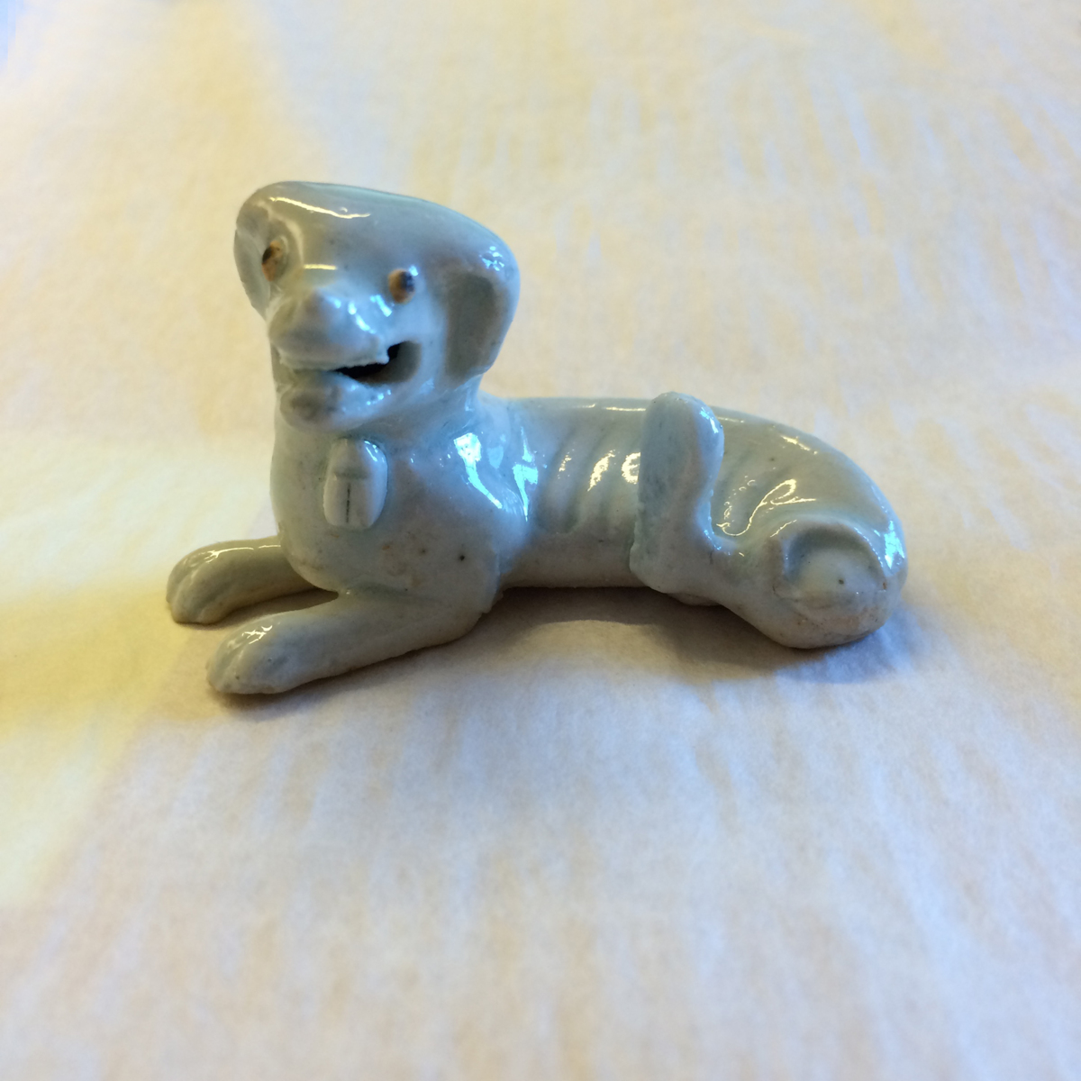 Hund i ljus turkosblå glasyr på ovansidan, oglaserad på undersidan, liggande med höger ben under kroppen, skarabé i ett band runt halsen.
