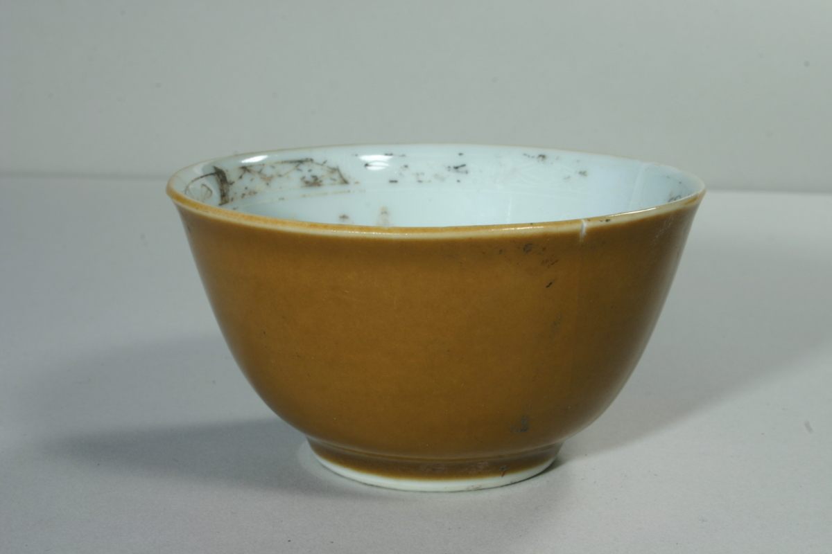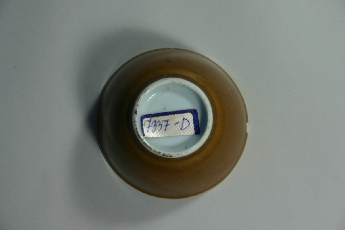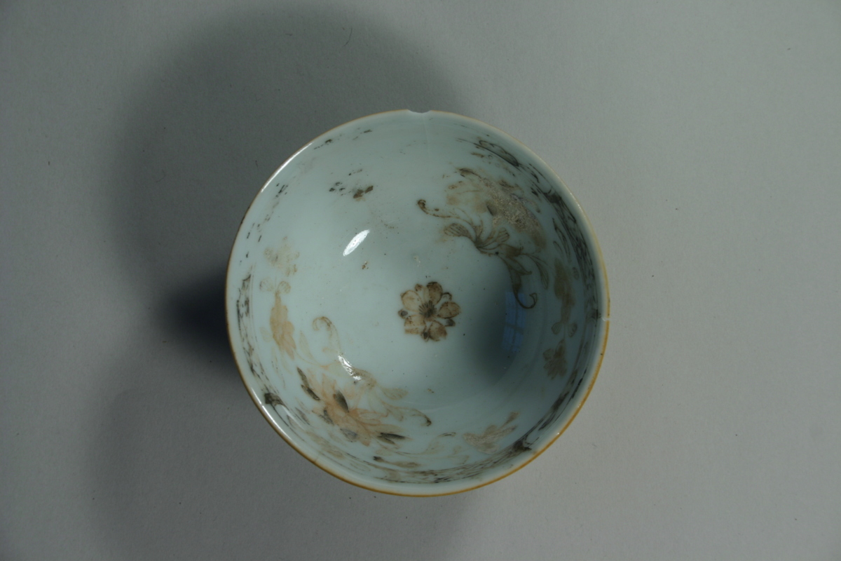 Brun glasyr på utsidan, vit med överglasyrdekor på insidan, blommor och kantdekor. Kantavslag i mynningskanten.