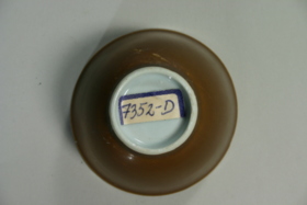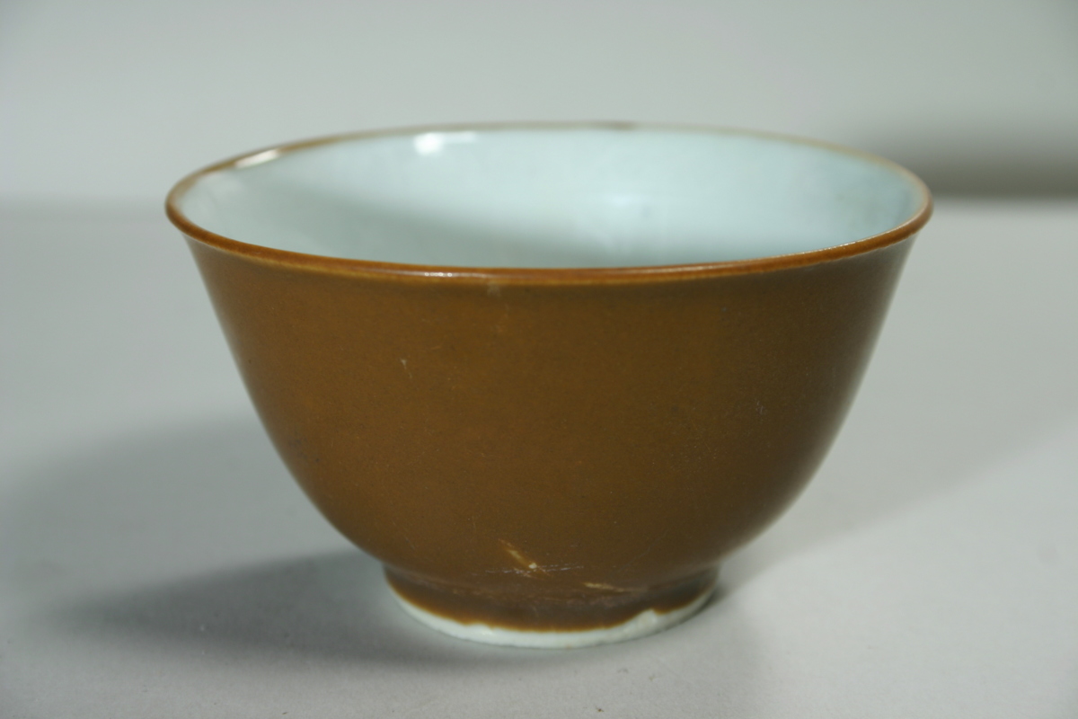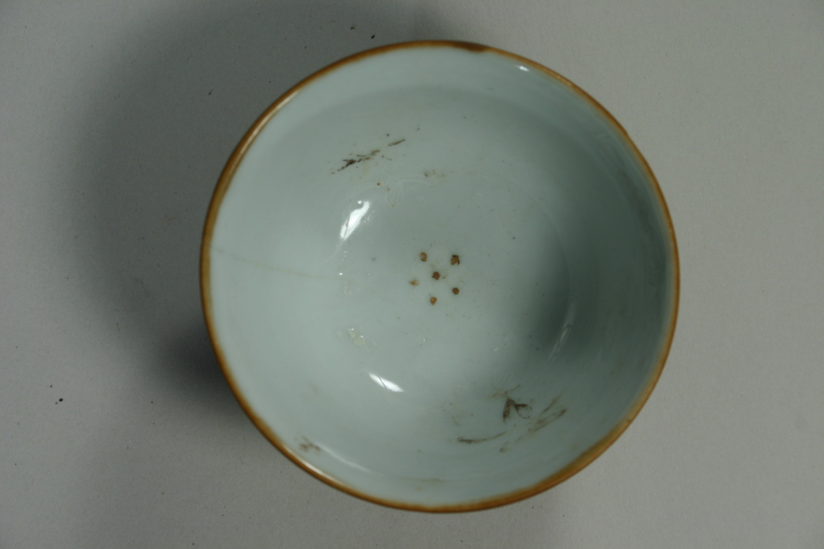 Brun glasyr på utsidan, vit med överglasyrdekor på undersidan