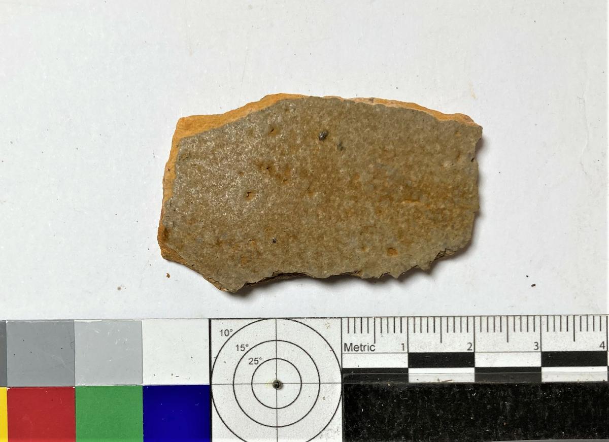 Skärva av kärl, lätt välvd, drejad. Orange gods, grågrön glasyr på utsidan. Avbruten i alla kanter.