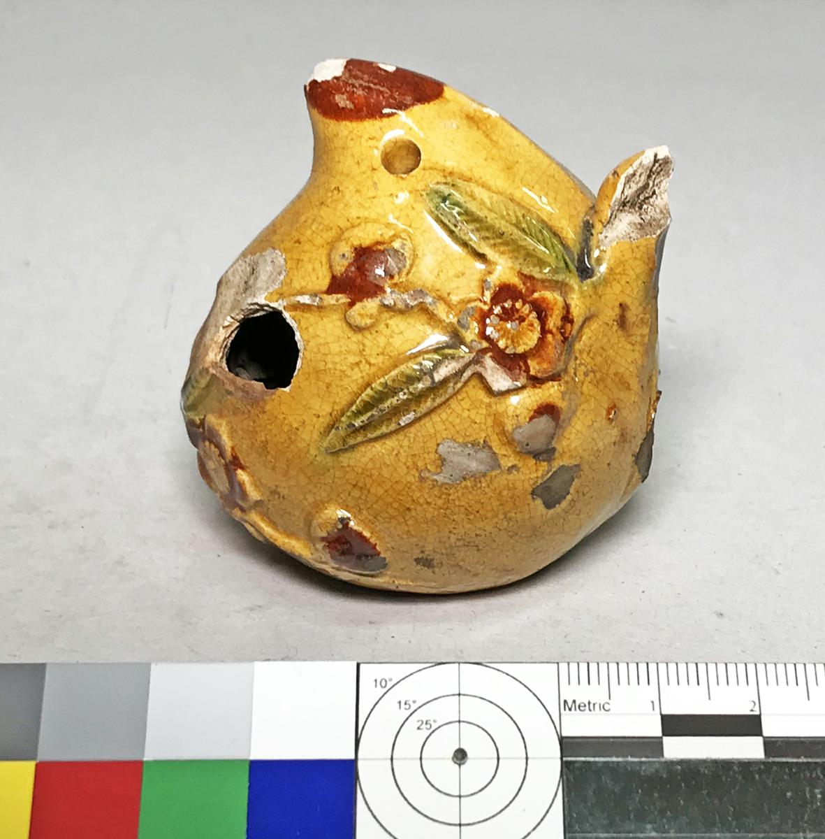 Persika, Gul fint krackelerad glasyr, rödbruna blommor och gröna blad. 2 hål för rökelse. Avbrutet skaft, hål i sidan. Annars hel.