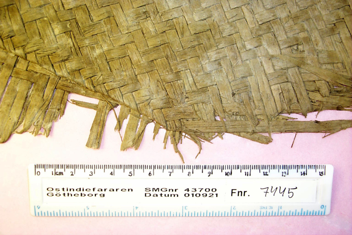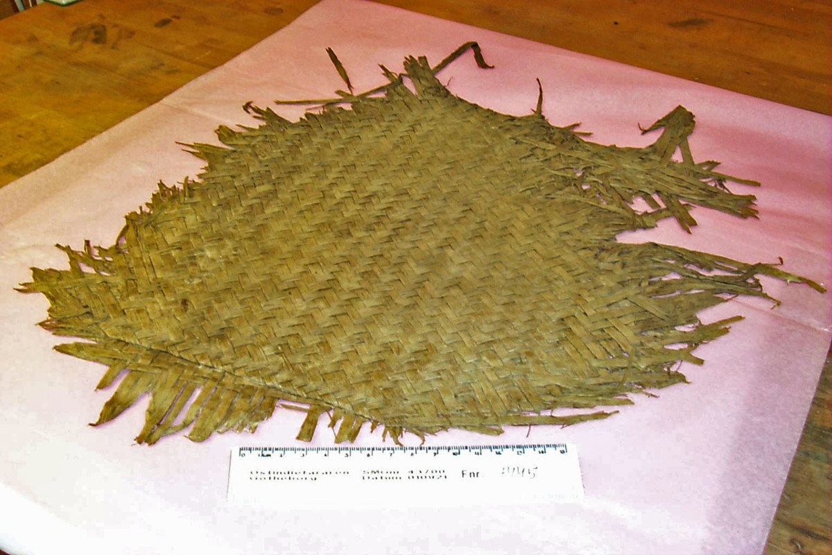 1) Mått ovan, Matta, kypertbindning, av någon form av bast eller gräs, vikt i ena kanten/dubbel.