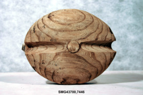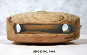1) Block i alm, hugget och skuret. Skåra för skiva, l: 185 mm, b: 28 mm. Urtag för stropp, b:25 mm. Skivan i pockenholz d: 145 mm, t: 25 mm, urtag för löpare 20 mm. Nagel d: 28 mm.