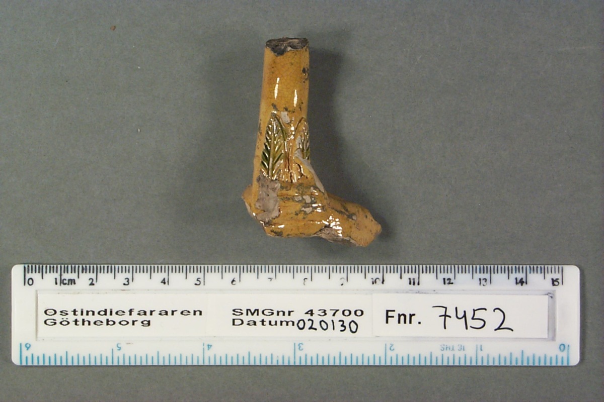 Pip till kanna? Gul glasyr, blad kring pipens fot, vänsterhand håller kring pipen.