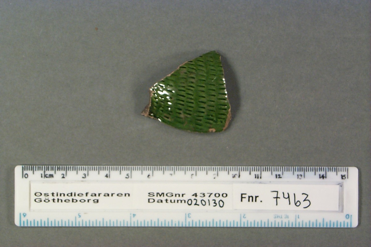 Föremålet är från vraket av ostindiefararen Götheborg, som gjorde tre resor till Kina 1739-45. Vid hemkomsten från den sista resan 12 september 1745 förliste fartyget vid grundet Hunnebådan strax utanför Nya Elfsborgs fästning. Vid flera tillfällen har material tagits upp från vraket. Föremålet kommer från de marinarkeologiska utgrävningarna på platsen 1986-1992.