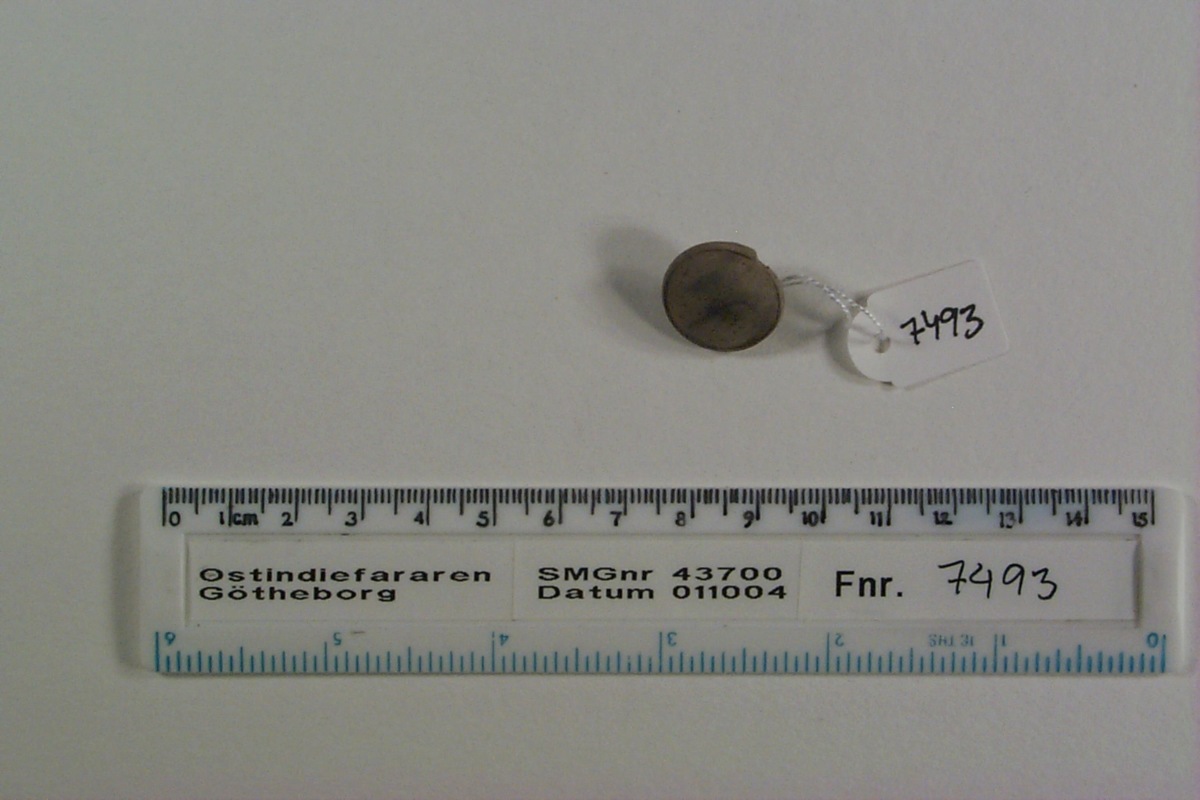 Undersydd knapp;svarvad med låg fot h: 4 mm, med genomgående hål för tråd, brätte svagt kullrigt. Dekorrand runt brättets kant.