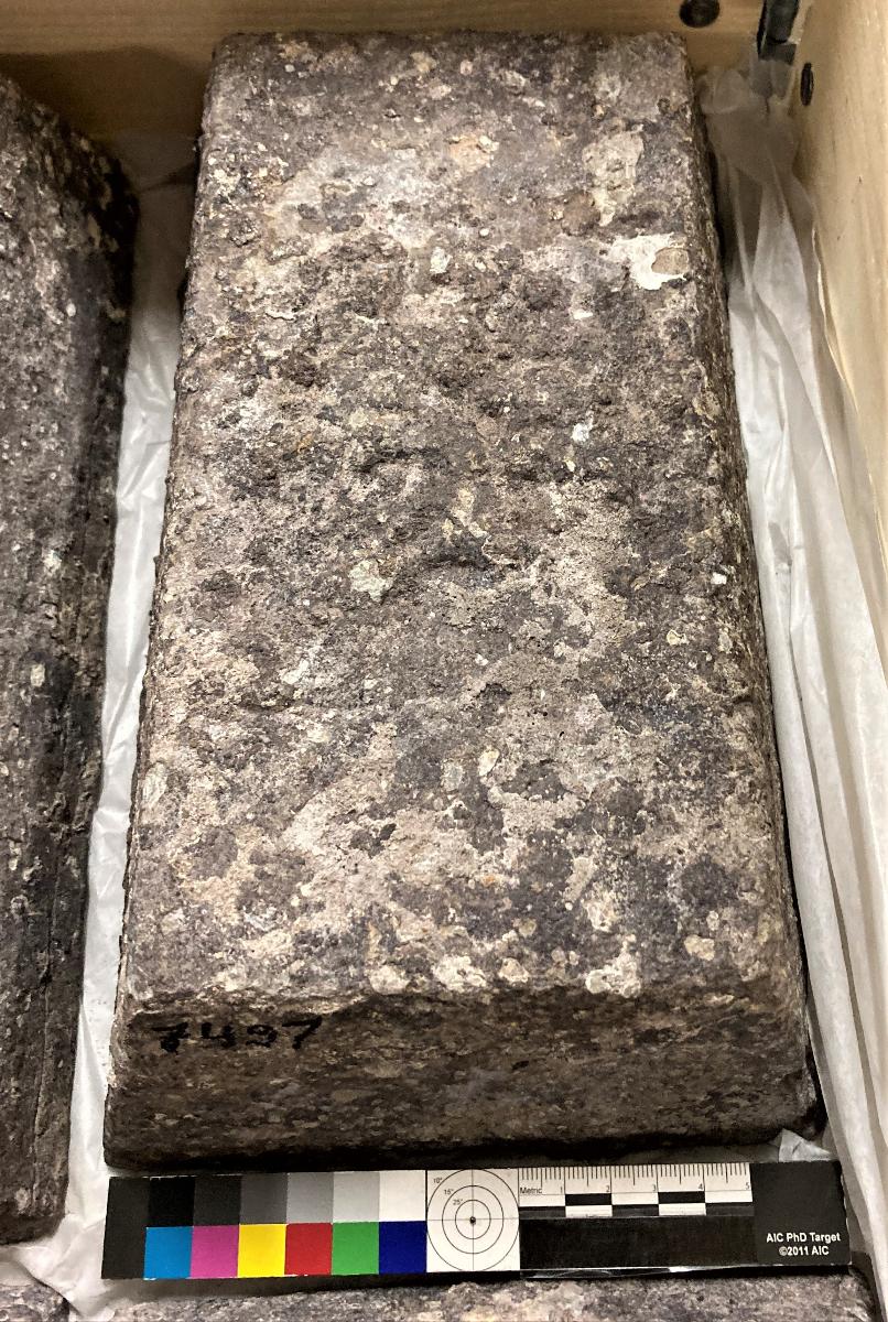 Föremålet kommer från lasten. En klump vitt pigment (ev. korrosionsprodukt) låg på tackan och samlades in separat.