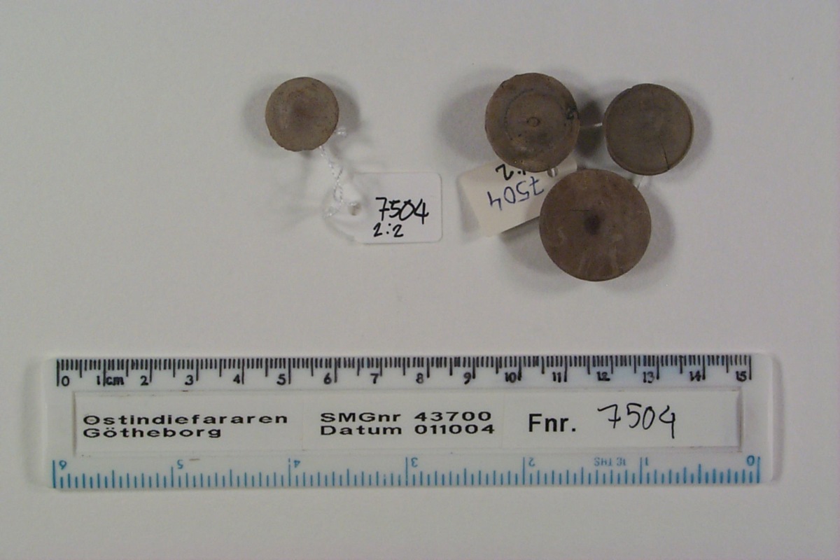 1) Tre undersydda knappar av ben med måtten A) d: 24 mm, h: 10 mm, koniskt med en stor vinkel, B) d: 20 mm, h: 7 mm, lätt välvd, dekorrand kring brättets kant, C) d: 21 mm, h: 7 mm, svagt konisk med kraterliknande fördjupning i mitten, liten knopp i mitten av denna som rest av svarvning.
