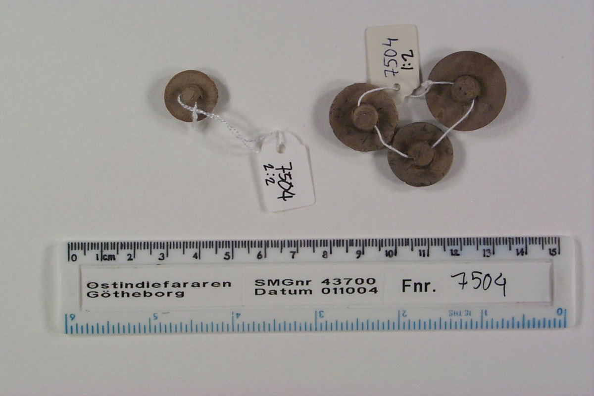 2) En undersydd knapp av trä, bemålad i svagt gulbrun färg. Lätt välvd ovansida.