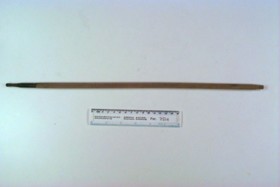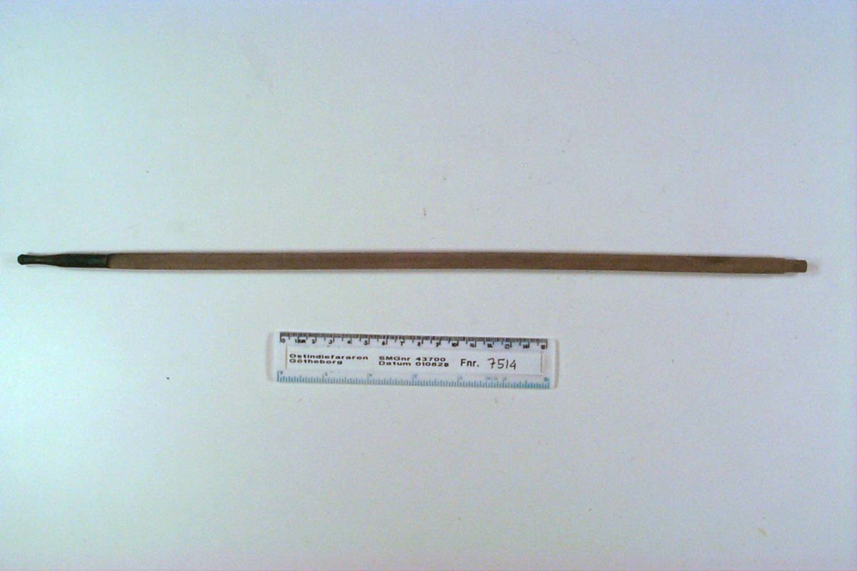 Vassliknande träslag. Ihåligt rör med utskurna tappar för munstycke resp. huvud. Huvud saknas. Munstycket av metall.