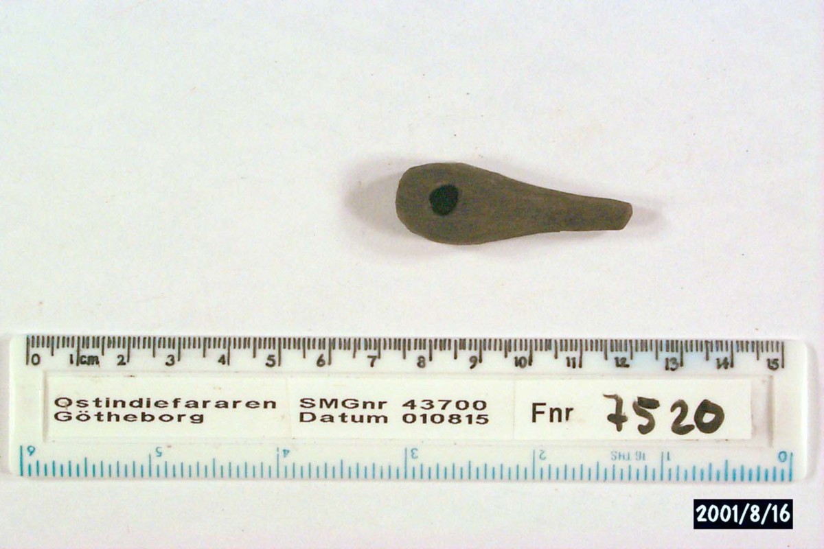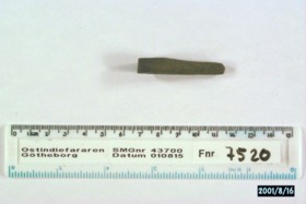 Föremålet är från vraket av ostindiefararen Götheborg, som gjorde tre resor till Kina 1739-45. Vid hemkomsten från den sista resan 12 september 1745 förliste fartyget vid grundet Hunnebådan strax utanför Nya Elfsborgs fästning. Vid flera tillfällen har material tagits upp från vraket. Föremålet kommer från de marinarkeologiska utgrävningarna på platsen 1986-1992.