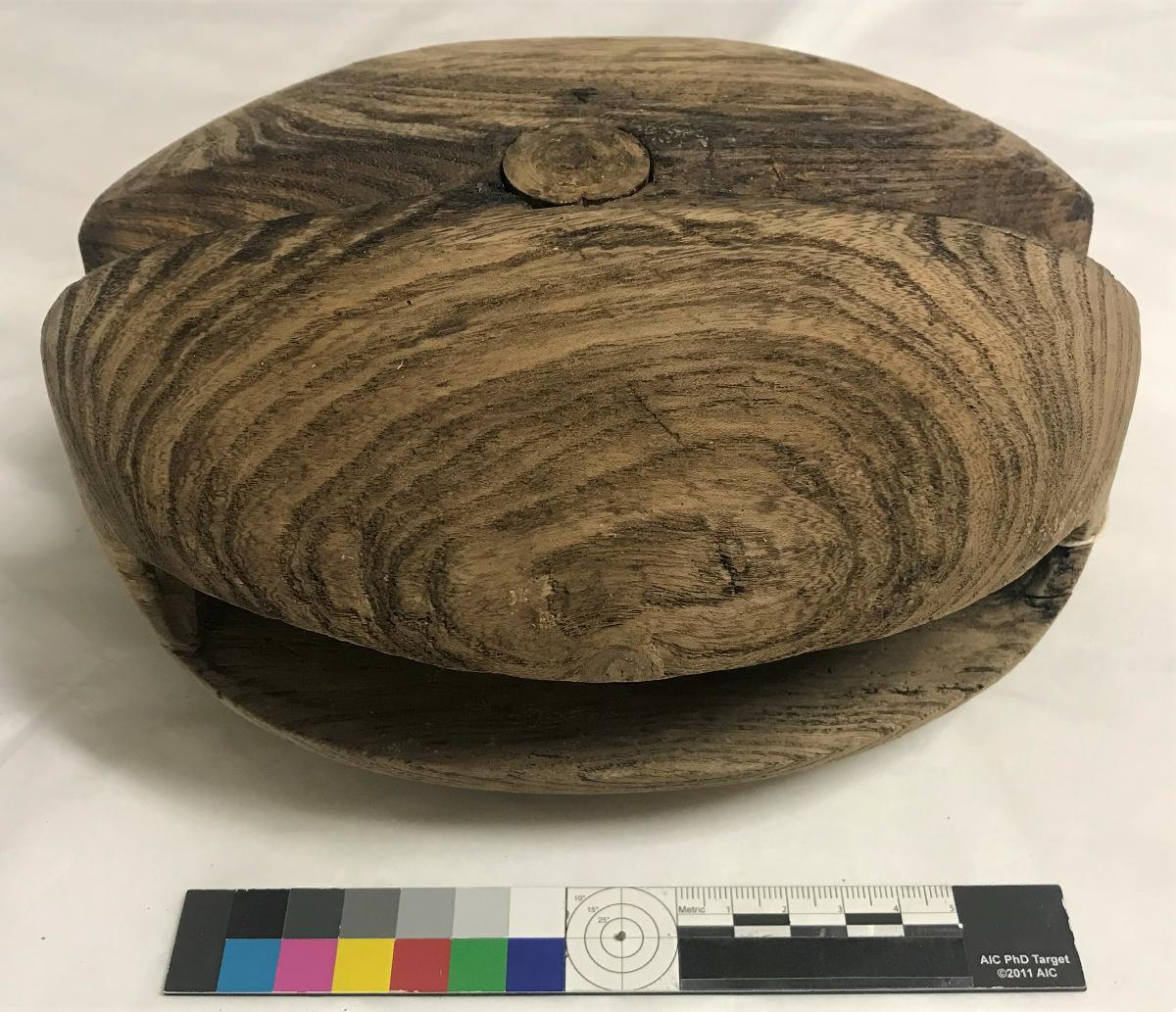 Block, enkelt, hugget/skuret. Skivan d: 210 mm, t: ca 24 mm, spårets d: ca 18 mm. Nagel, d: 23-27 mm, sågad i ena änden, skuren i andra änden.