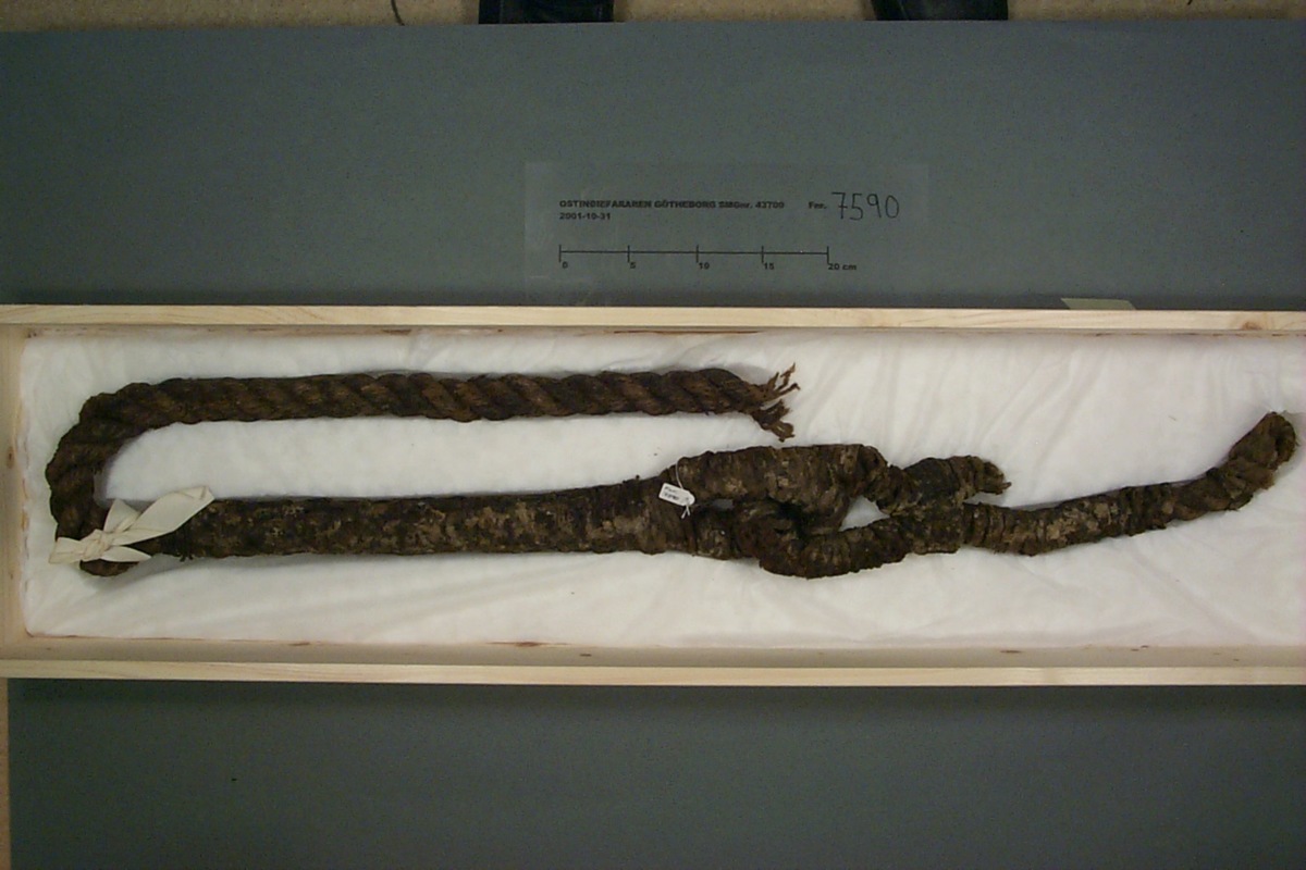Blockstropp, del av. Avbruten i splitsen som saknas helt. D: 30 mm, klädd med sjömansgarn. Hjärtbändsel av sjömansgarn. Stjärt med splitsat öga i blockstroppens öga. Stjärten är klädd med sjömansgarn och splitsen är vävd med tregarnsplatting i längden och märling tre varv runt i varje byte.