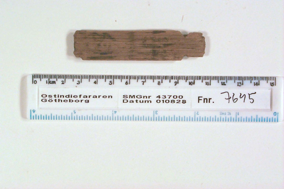 Föremålet är från vraket av ostindiefararen Götheborg, som gjorde tre resor till Kina 1739-45. Vid hemkomsten från den sista resan 12 september 1745 förliste fartyget vid grundet Hunnebådan strax utanför Nya Elfsborgs fästning. Vid flera tillfällen har material tagits upp från vraket. Föremålet kommer från de marinarkeologiska utgrävningarna på platsen 1986-1992.