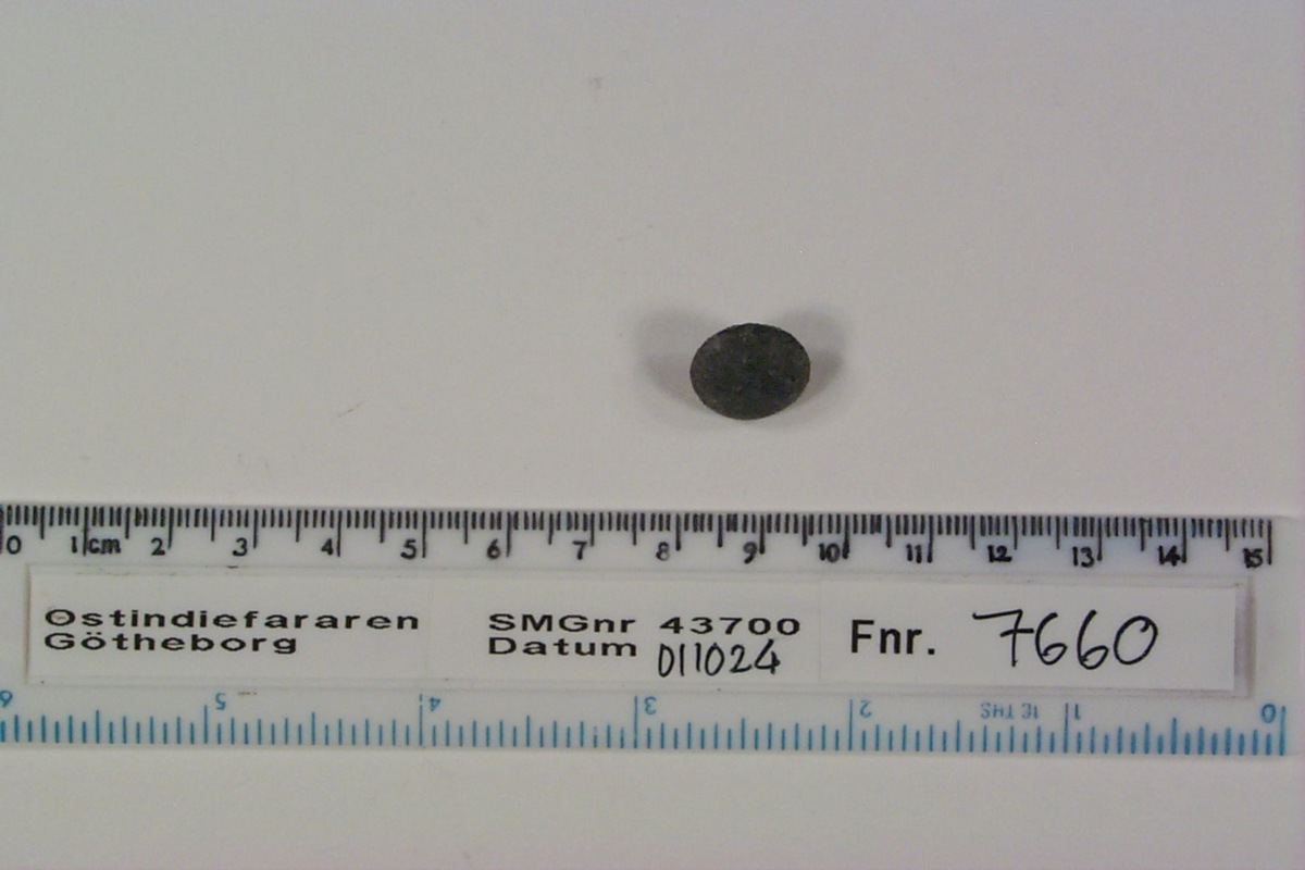 Kullrig rund knapp, slät på ovansidan, rest av fäste på undersidan.