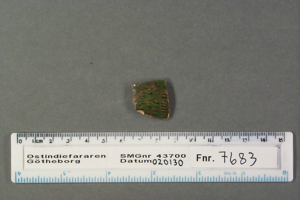 Föremålet är från vraket av ostindiefararen Götheborg, som gjorde tre resor till Kina 1739-45. Vid hemkomsten från den sista resan 12 september 1745 förliste fartyget vid grundet Hunnebådan strax utanför Nya Elfsborgs fästning. Vid flera tillfällen har material tagits upp från vraket. Föremålet kommer från de marinarkeologiska utgrävningarna på platsen 1986-1992.