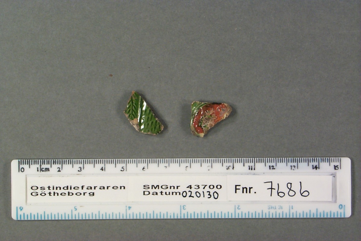 Figur, del av, liten skärva, röd och grön glasyr.