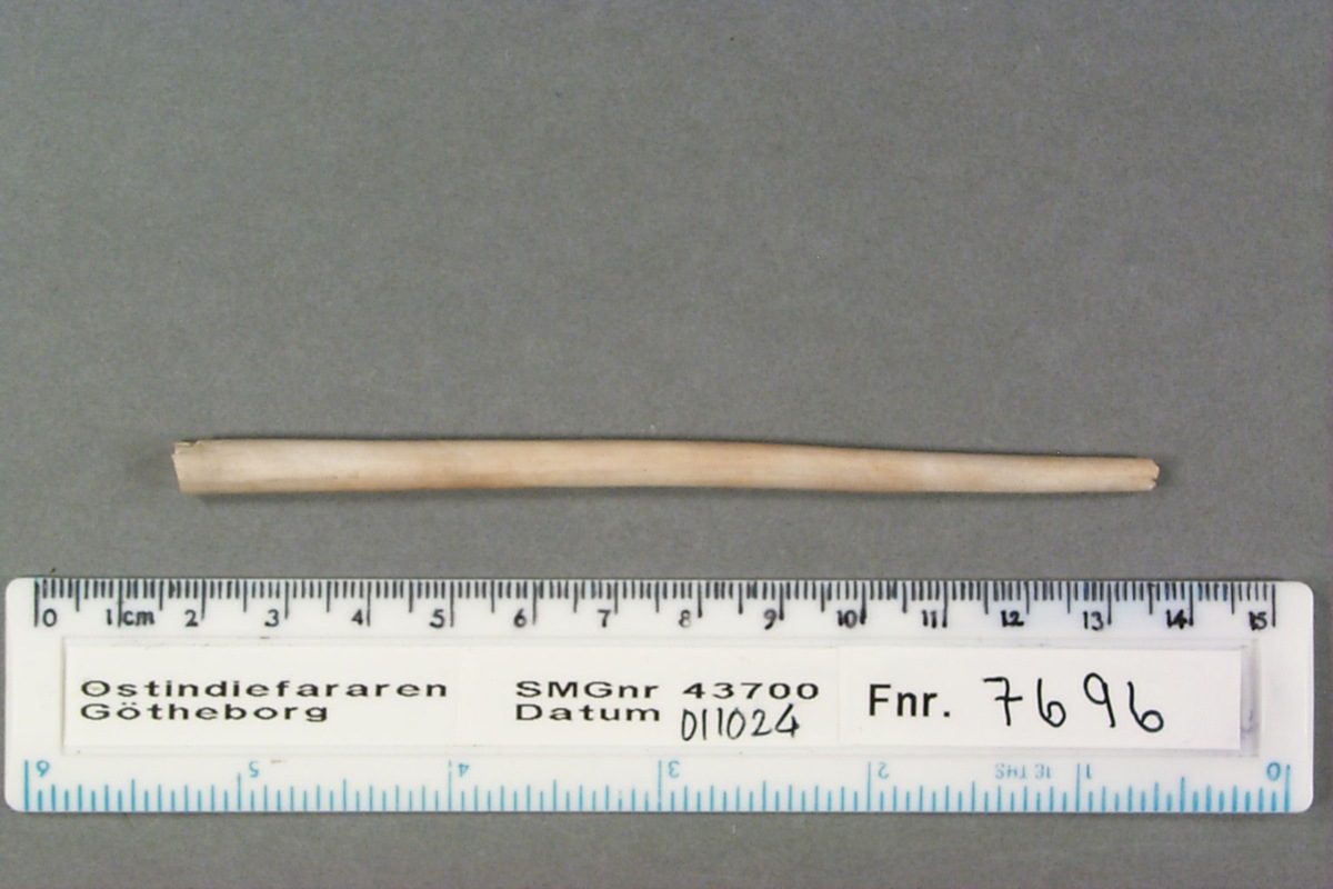 Avbrutet i båda ändar, ingen dekor. Mycket smalt i ena änden, 3,5 mm.