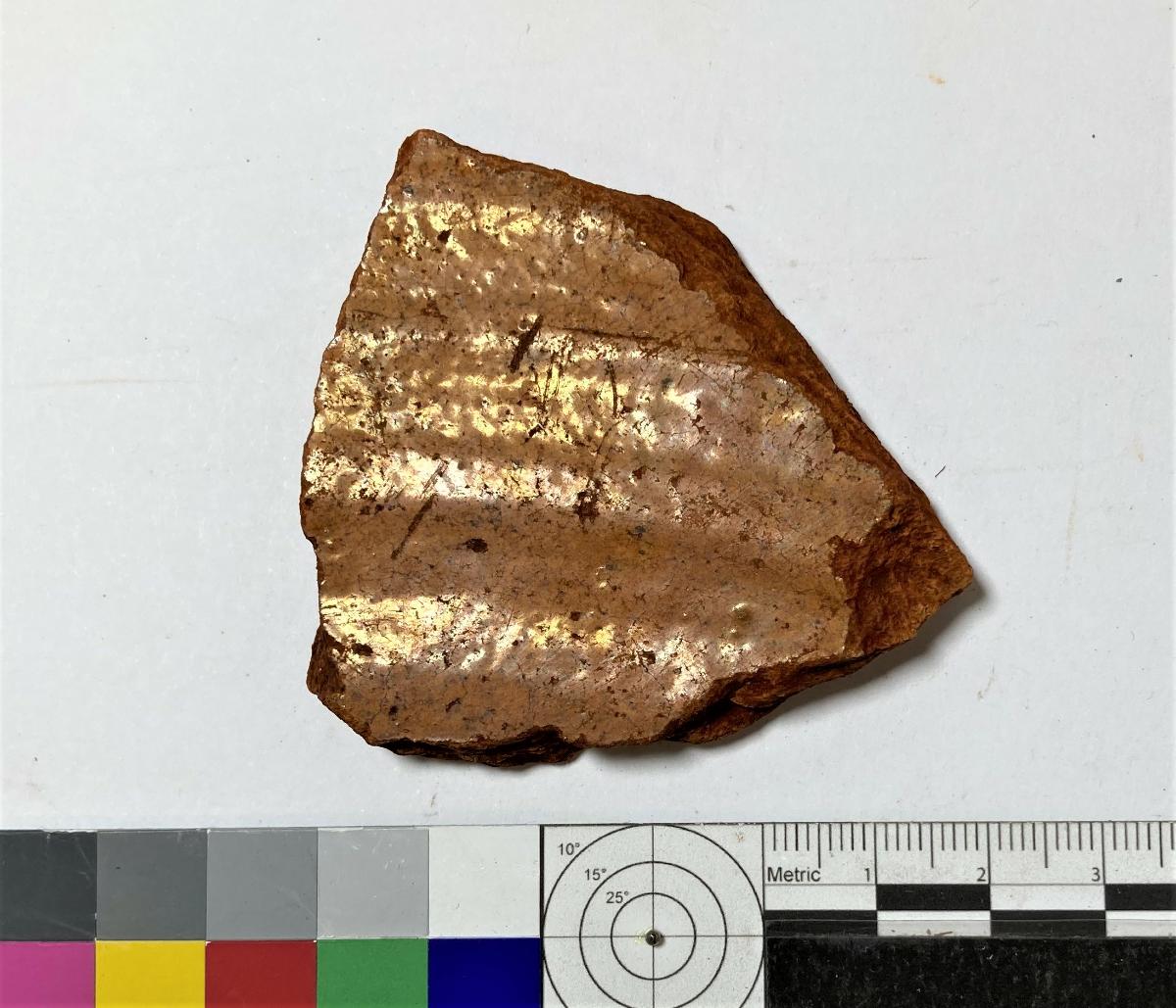 Skärva av kärl, rött gods, orange/gul glasyr på ena sidan. Hör samman med fnr. 7649.