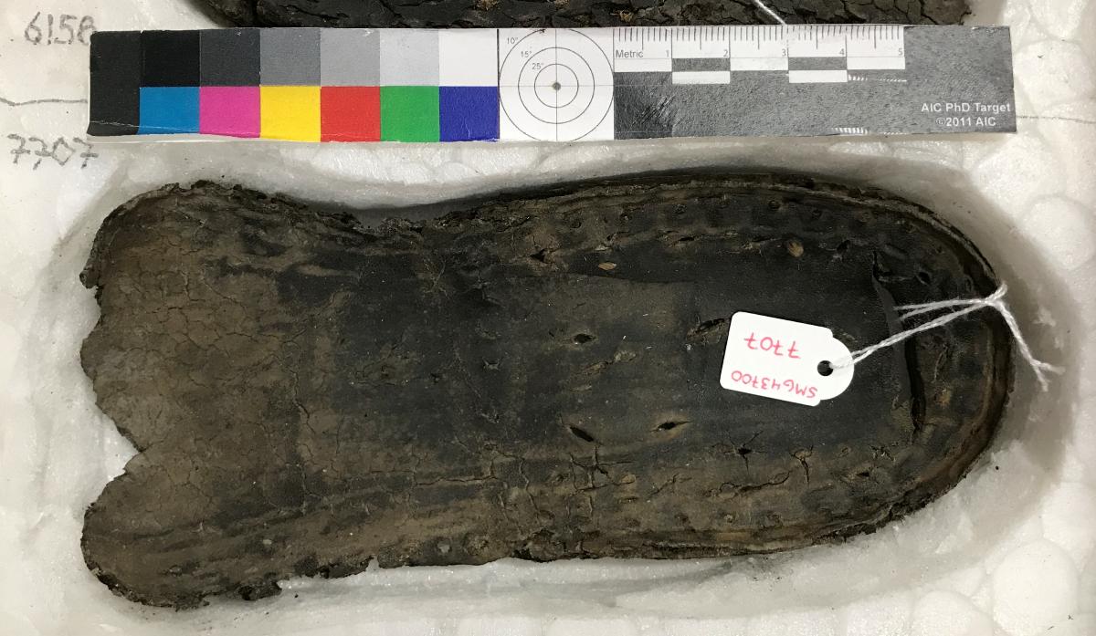 Skosula, bakre delen, innersula, avbruten i främre delen av foten, sliten efter användning. Hål efter pliggar och söm, rester av pliggar.