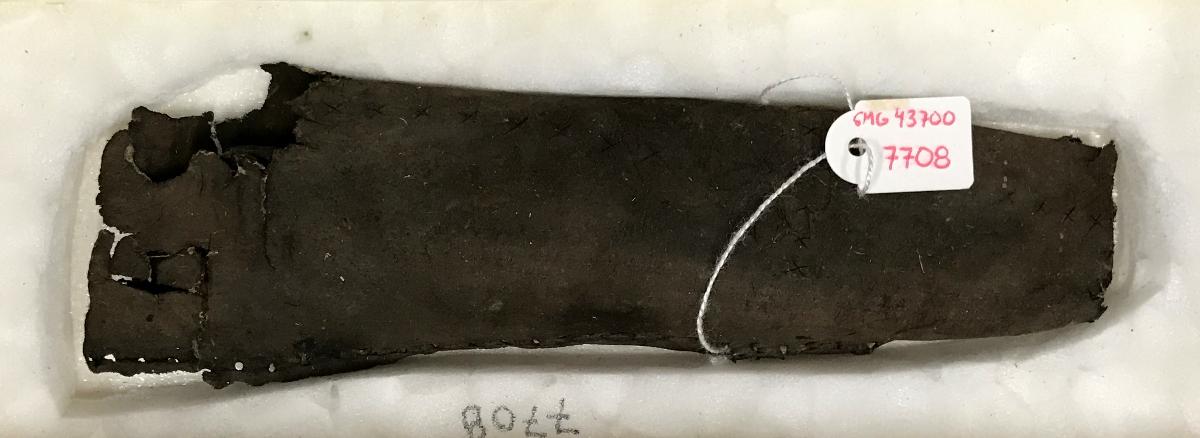 Knivslida, defekt. Tillverkad av ett läderstycke som sytts samman i längden på baksidan, rester av tråd finns kvar i hålen. Skåra på baksidan för fäste. Dekor: ristade/skurna små kryss i en rad längs sidan och en rad tvärs sidan samt en enkel stiliserad blomma inskriven i en ring.