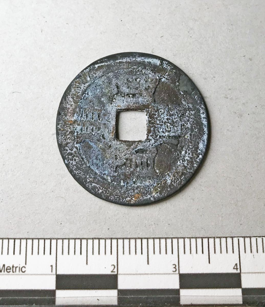 Cirkulärt mynt med fyrkantigt hål sidan 5mm i mitten. Kinesiska tecken på båda sidor.