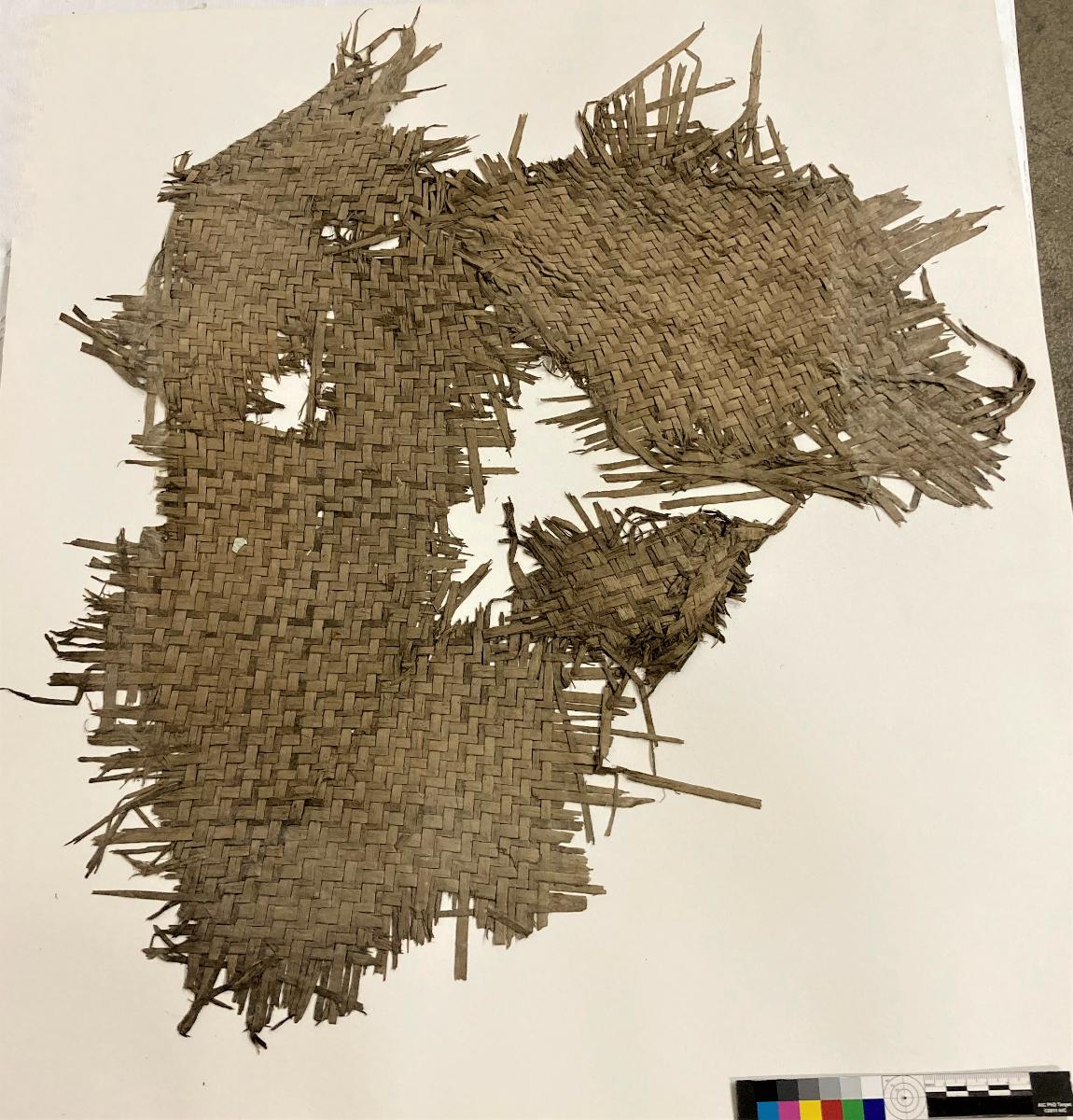 1) L: 50 mm, b: 37 mm, t: 3 mm, Matta lagd av bast eller gräs, kypertväv i mönstret.