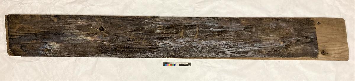 Planka, skåror i långsidorna, sågade i kortsidorna, brunmålad på ena sidan och i stort sett hela andra sidan. Prov på bemålad yta är insamlad.