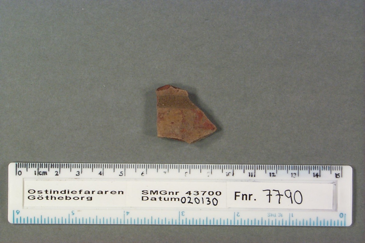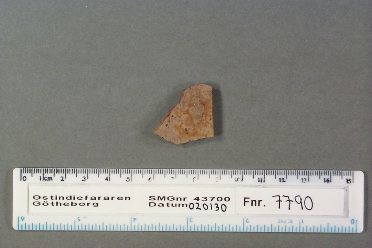 Föremålet är från vraket av ostindiefararen Götheborg, som gjorde tre resor till Kina 1739-45. Vid hemkomsten från den sista resan 12 september 1745 förliste fartyget vid grundet Hunnebådan strax utanför Nya Elfsborgs fästning. Vid flera tillfällen har material tagits upp från vraket. Föremålet kommer från de marinarkeologiska utgrävningarna på platsen 1986-1992.