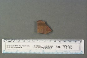 Skärva av kärl, rödbrunt gods, grå på ena sidan, brun på andra sidan, ingen glasyr.
